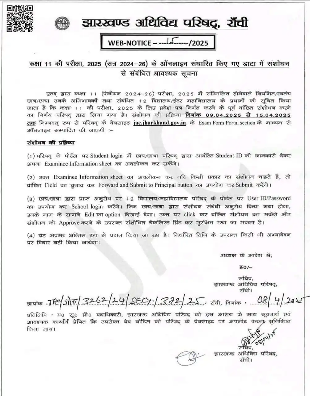 It is hereby informed to the regular/independent students (the registration year 2025-27), their parents, and the concerned school / inter-college heads, appearing in class- 9 and 11 examination, 2025 that class- 9 and 11 The decision has been taken by the Council to amend the necessary errors before making the Admit Card for the examination, 2025. The process of amendment will be done online through the council’s website www.jac.jharkhand.gov.in/jac/ from the following date:-